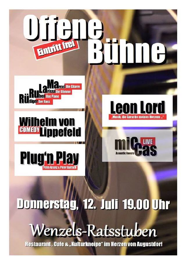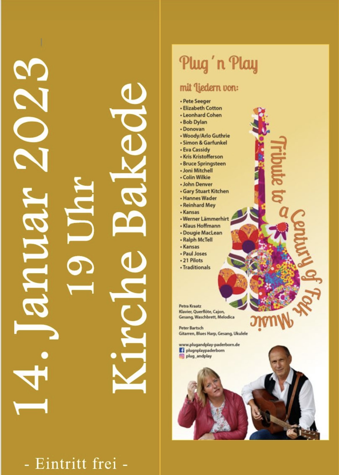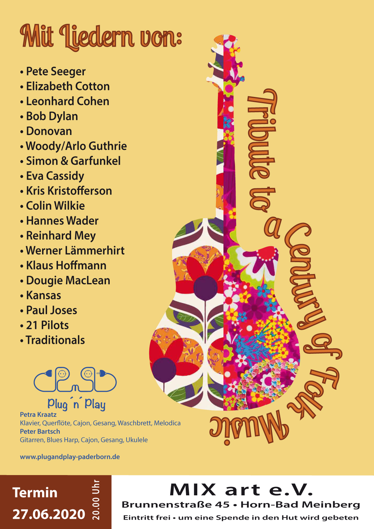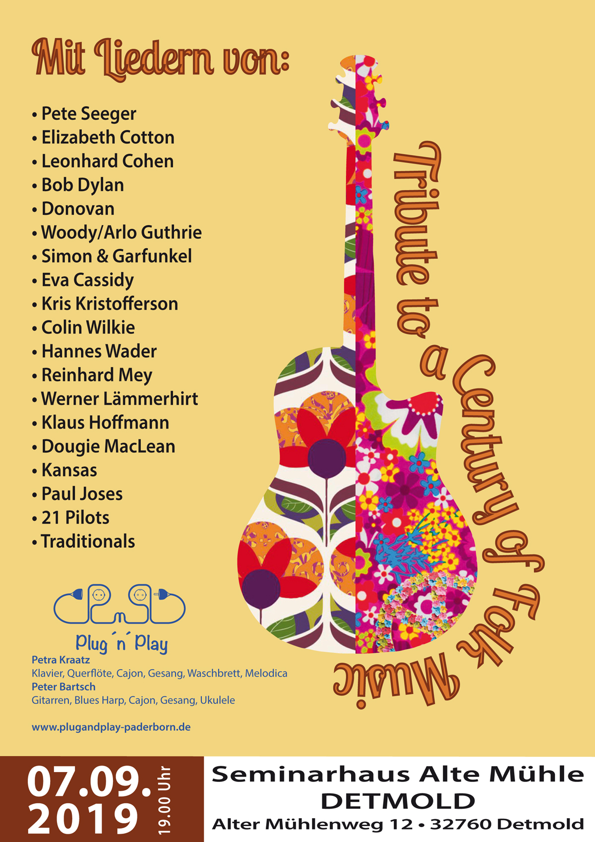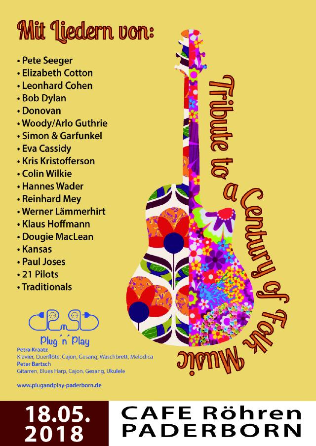 Donnerstag, 12.07.2018 Beginn 19 Uhr Plug´n Play etwa 20.15 Uhr - Ausschnitte aus dem Programm "Tribute to a Century of Folk Music" Offene Bühne "Ratsstuben Augustdorf" Pivitsheider Straße 32832 Augustdorf https://www.facebook.com/events/458958011199638/ |